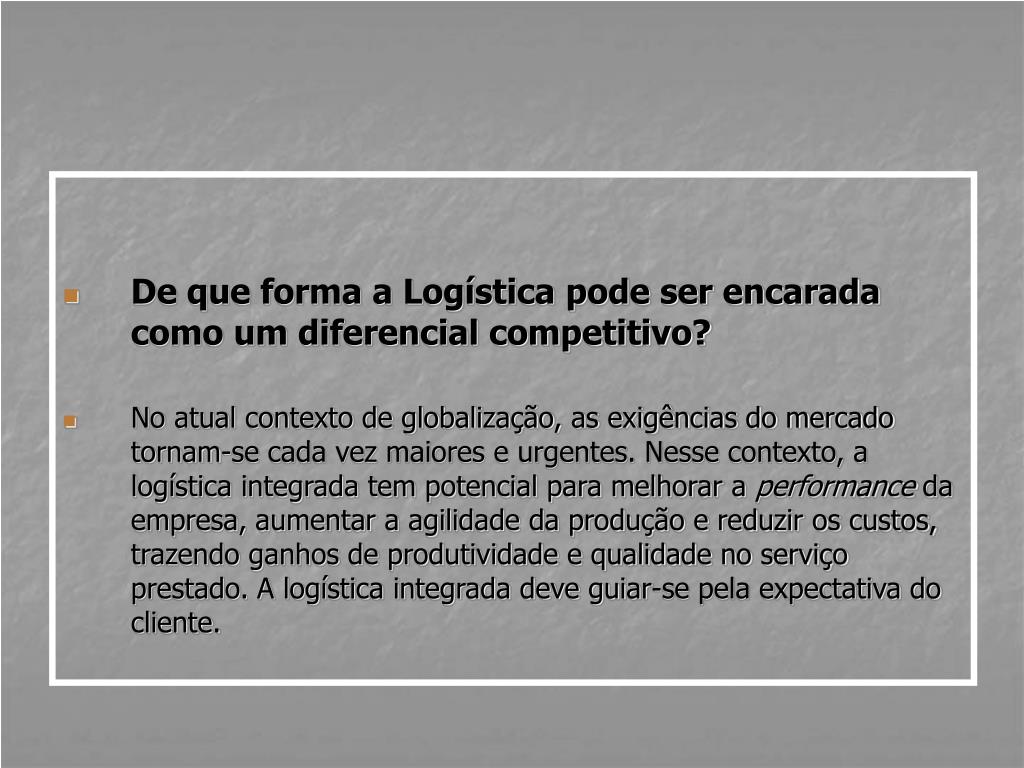 De que forma a Logística pode ser encarada como um diferencial competitivo? • No atual contexto de globalização, as exigências do mercado tornam-se cada vez maiores e urgentes. Nesse contexto, a logística integrada tem potencial para melhorar a performance da empresa, aumentar a agilidade da produção e reduzir os custos, trazendo ganhos de produtividade e qualidade no serviço prestado. A logística integrada deve guiar-se pela expectativa do cliente.
