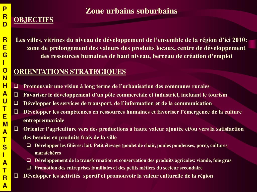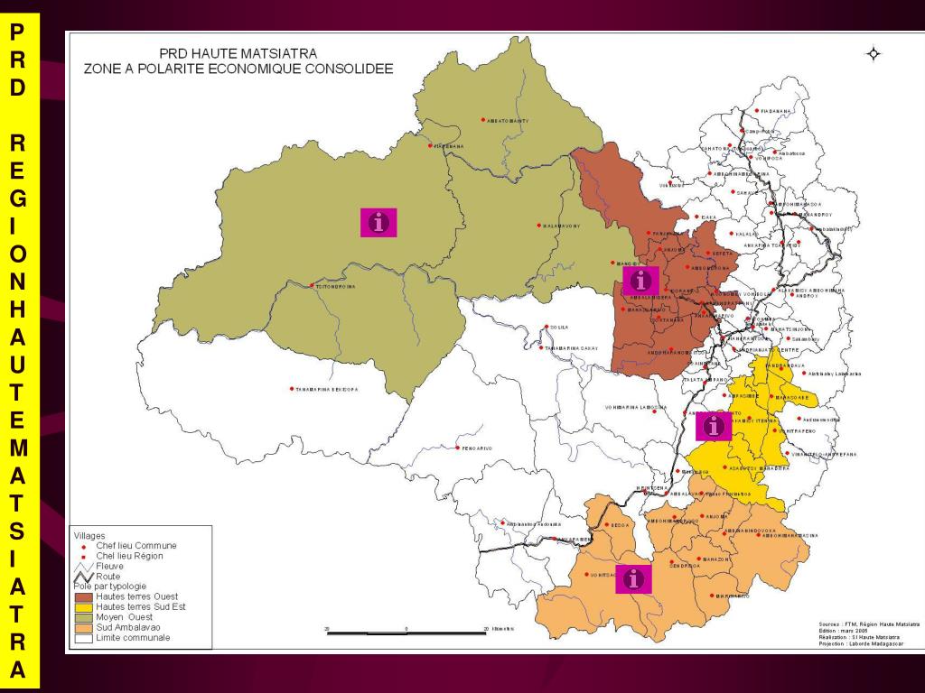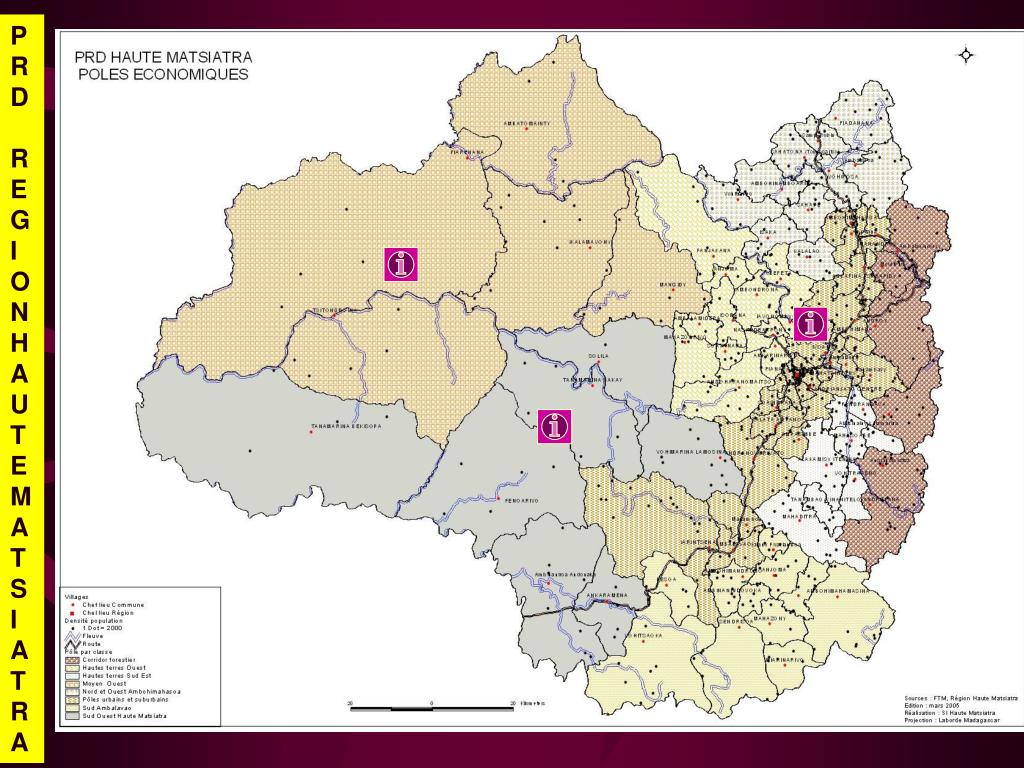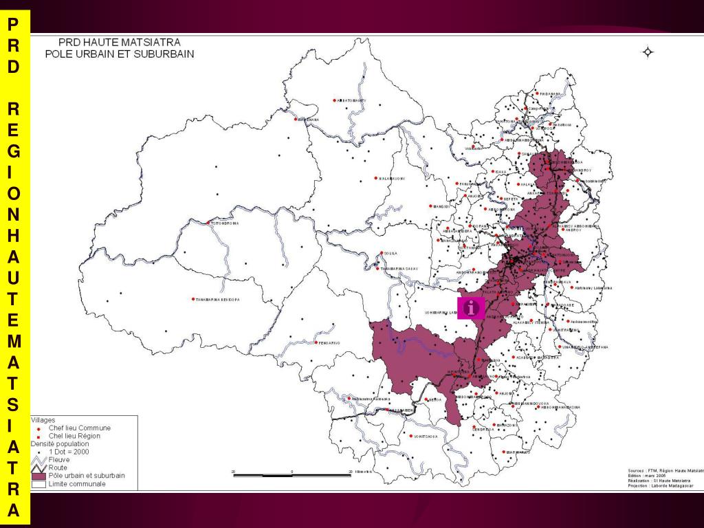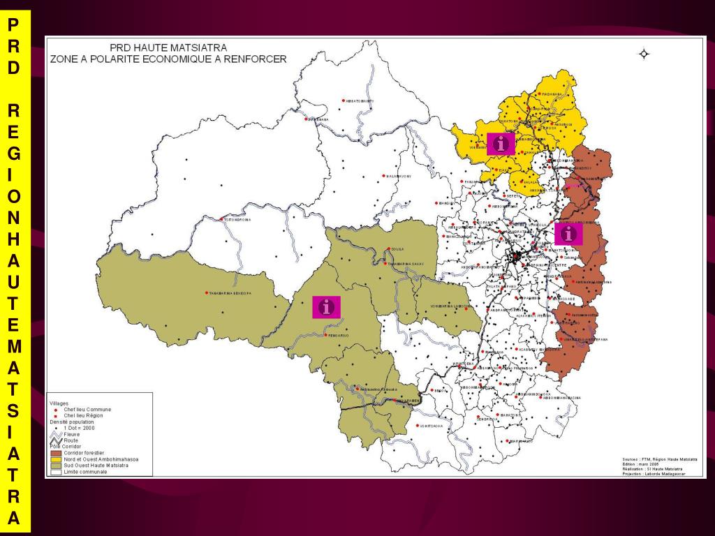 PRD REGION HAUTE MATSIATRA • Zone urbains suburbains • OBJECTIFS • Les villes, vitrines du niveau de développement de l’ensemble de la région d’ici 2010: zone de prolongement des valeurs des produits locaux, centre de développement des ressources humaines de haut niveau, berceau de création d’emploi • ORIENTATIONS STRATEGIQUES • Promouvoir une vision à long terme de l’urbanisation des communes rurales • Favoriser le développement d’un pôle commerciale et industriel, incluant le tourism • Développer les services de transport, de l’information et de la communication • Développer les compétences en ressources humaines et favoriser l’émergence de la culture entrepreunariale • Orienter l’agriculture vers des productions à haute valeur ajoutée et/ou vers la satisfaction des besoins en produits frais de la ville • Développer les filières: lait, Petit élevage (poulet de chair, poules pondeuses, porc), cultures maraîchères • Développement de la transformation et conservation des produits agricoles: viande, foie gras • Promotion des entreprises familiales et des petits métiers du secteur secondaire • Développer les activités sportif et promouvoir la valeur culturelle de la région