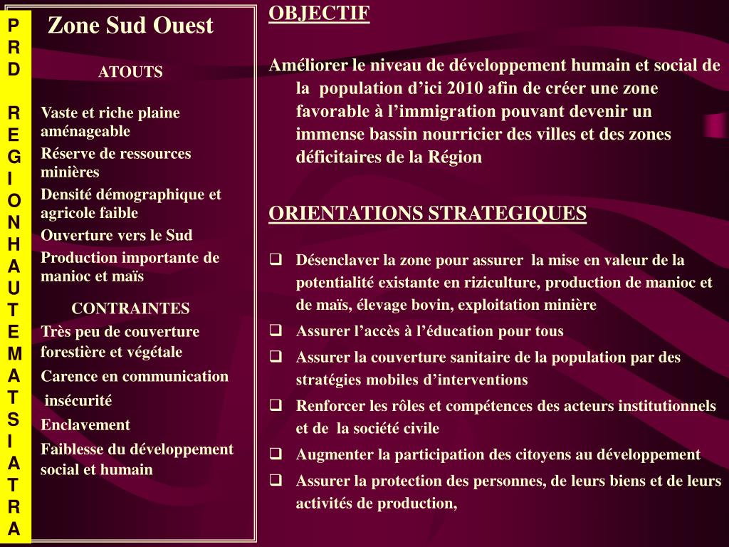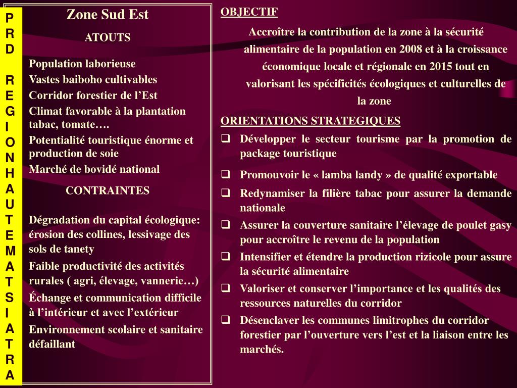 OBJECTIF • Améliorer le niveau de développement humain et social de la population d’ici 2010 afin de créer une zone favorable à l’immigration pouvant devenir un immense bassin nourricier des villes et des zones déficitaires de la Région • ORIENTATIONS STRATEGIQUES • Désenclaver la zone pour assurer la mise en valeur de la potentialité existante en riziculture, production de manioc et de maïs, élevage bovin, exploitation minière • Assurer l’accès à l’éducation pour tous • Assurer la couverture sanitaire de la population par des stratégies mobiles d’interventions • Renforcer les rôles et compétences des acteurs institutionnels et de la société civile • Augmenter la participation des citoyens au développement • Assurer la protection des personnes, de leurs biens et de leurs activités de production, • Zone Sud Ouest • ATOUTS • Vaste et riche plaine aménageable • Réserve de ressources minières • Densité démographique et agricole faible • Ouverture vers le Sud • Production importante de manioc et maïs • CONTRAINTES • Très peu de couverture forestière et végétale • Carence en communication • insécurité • Enclavement • Faiblesse du développement social et humain PRD REGION HAUTE MATSIATRA