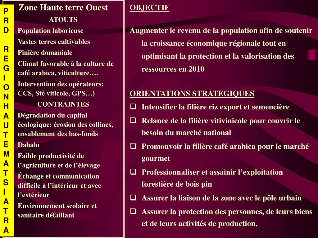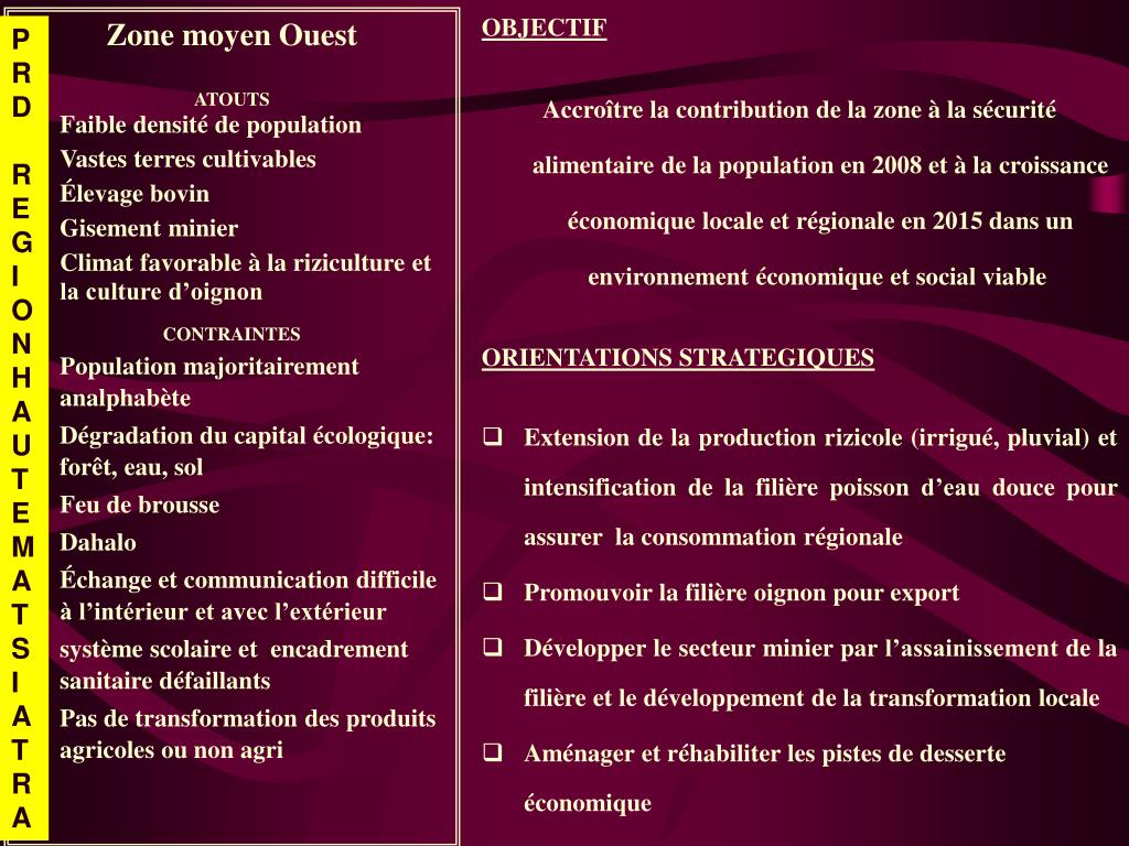 PRD REGION HAUTE MATSIATRA. PRD REGION HAUTE MATSIATRA. Zone moyen Ouest ATOUTS Faible densité de population Vastes terres cultivables Élevage bovin Gisement minier Climat favorable à la riziculture et la culture d’oignon CONTRAINTES Population majoritairement analphabète