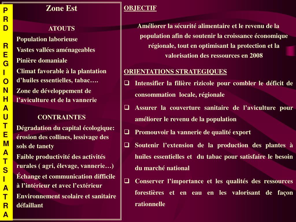 Zone Est • ATOUTS • Population laborieuse • Vastes vallées aménageables • Pinière domaniale • Climat favorable à la plantation d’huiles essentielles, tabac…. • Zone de développement de l’aviculture et de la vannerie • CONTRAINTES • Dégradation du capital écologique: érosion des collines, lessivage des sols de tanety • Faible productivité des activités rurales ( agri, élevage, vannerie…) • Échange et communication difficile à l’intérieur et avec l’extérieur • Environnement scolaire et sanitaire défaillant PRD REGION HAUTE MATSIATRA OBJECTIF Améliorer la sécurité alimentaire et le revenu de la population afin de soutenir la croissance économique régionale, tout en optimisant la protection et la valorisation des ressources en 2008 ORIENTATIONS STRATEGIQUES • Intensifier la filière rizicole pour combler le déficit de consommation locale, régionale • Assurer la couverture sanitaire de l’aviculture pour améliorer le revenu de la population • Promouvoir la vannerie de qualité export • Soutenir l’extension de la production des plantes à huiles essentielles et du tabac pour satisfaire le besoin du marché national • Conserver l’importance et les qualités des ressources forestières et en eau en les valorisant de façon rationnelle