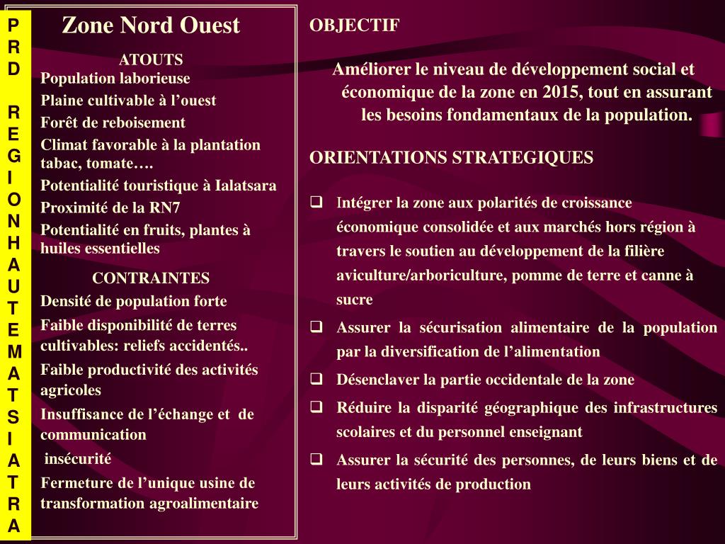 OBJECTIF • Améliorer le niveau de développement social et économique de la zone en 2015, tout en assurant les besoins fondamentaux de la population. • ORIENTATIONS STRATEGIQUES • Intégrer la zone aux polarités de croissance économique consolidée et aux marchés hors région à travers le soutien au développement de la filière aviculture/arboriculture, pomme de terre et canne à sucre • Assurer la sécurisation alimentaire de la population par la diversification de l’alimentation • Désenclaver la partie occidentale de la zone • Réduire la disparité géographique des infrastructures scolaires et du personnel enseignant • Assurer la sécurité des personnes, de leurs biens et de leurs activités de production • Zone Nord Ouest • ATOUTS • Population laborieuse • Plaine cultivable à l’ouest • Forêt de reboisement • Climat favorable à la plantation tabac, tomate…. • Potentialité touristique à Ialatsara • Proximité de la RN7 • Potentialité en fruits, plantes à huiles essentielles • CONTRAINTES • Densité de population forte • Faible disponibilité de terres cultivables: reliefs accidentés.. • Faible productivité des activités agricoles • Insuffisance de l’échange et de communication • insécurité • Fermeture de l’unique usine de transformation agroalimentaire PRD REGION HAUTE MATSIATRA