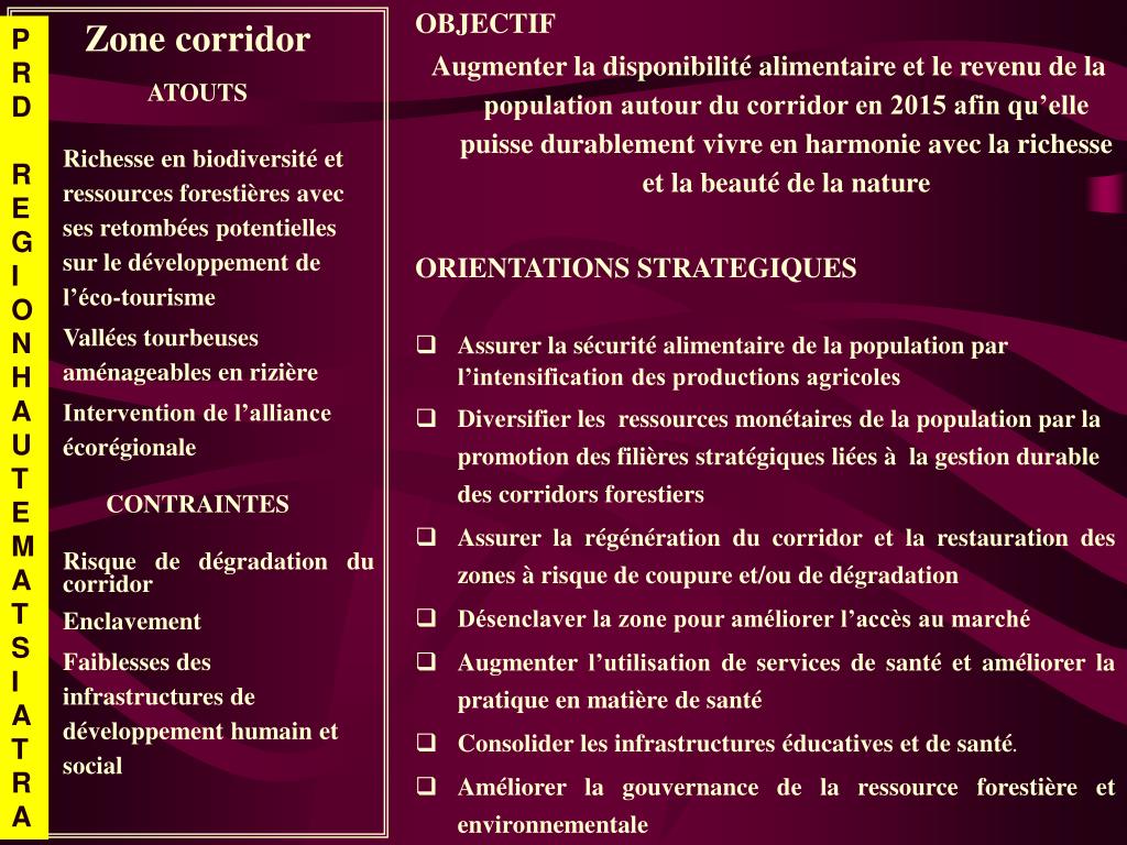 OBJECTIF • Augmenter la disponibilité alimentaire et le revenu de la population autour du corridor en 2015 afin qu’elle puisse durablement vivre en harmonie avec la richesse et la beauté de la nature • ORIENTATIONS STRATEGIQUES • Assurer la sécurité alimentaire de la population par l’intensification des productions agricoles • Diversifier les ressources monétaires de la population par la promotion des filières stratégiques liées à la gestion durable des corridors forestiers • Assurer la régénération du corridor et la restauration des zones à risque de coupure et/ou de dégradation • Désenclaver la zone pour améliorer l’accès au marché • Augmenter l’utilisation de services de santé et améliorer la pratique en matière de santé • Consolider les infrastructures éducatives et de santé. • Améliorer la gouvernance de la ressource forestière et environnementale • Zone corridor • ATOUTS • Richesse en biodiversité et ressources forestières avec ses retombées potentielles sur le développement de l’éco-tourisme • Vallées tourbeuses aménageables en rizière • Intervention de l’alliance écorégionale • CONTRAINTES • Risque de dégradation du corridor • Enclavement • Faiblesses des infrastructures de développement humain et social PRD REGION HAUTE MATSIATRA