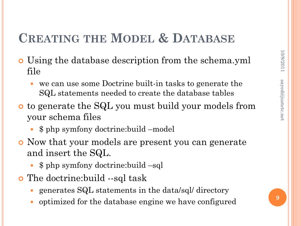 Creating the Model & Database • Using the database description from the schema.yml file • we can use some Doctrine built-in tasks to generate the SQL statements needed to create the database tables • to generate the SQL you must build your models from your schema files • $ phpsymfonydoctrine:build –model • Now that your models are present you can generate and insert the SQL. • $ phpsymfonydoctrine:build –sql • The doctrine:build --sql task • generates SQL statements in the data/sql/ directory • optimized for the database engine we have configured sayed@justetc.net