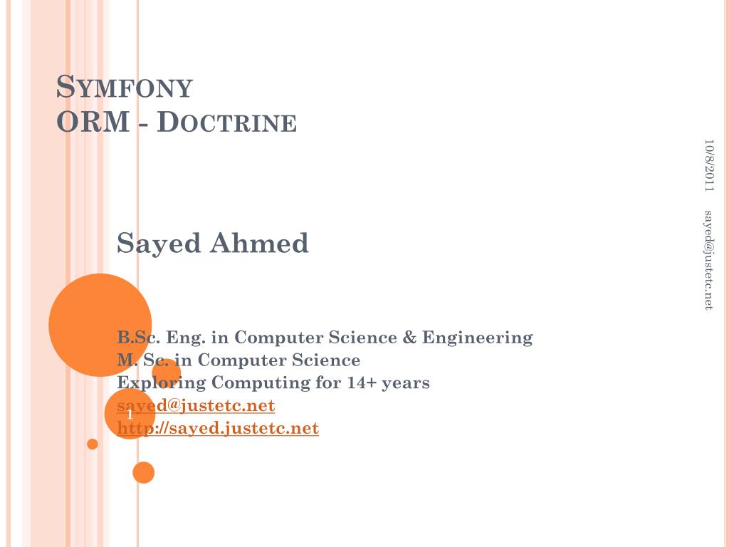 SymfonyORM - Doctrine sayed@justetc.net Sayed Ahmed B.Sc. Eng. in Computer Science & Engineering M. Sc. in Computer Science Exploring Computing for 14+ years sayed@justetc.net http://sayed.justetc.net