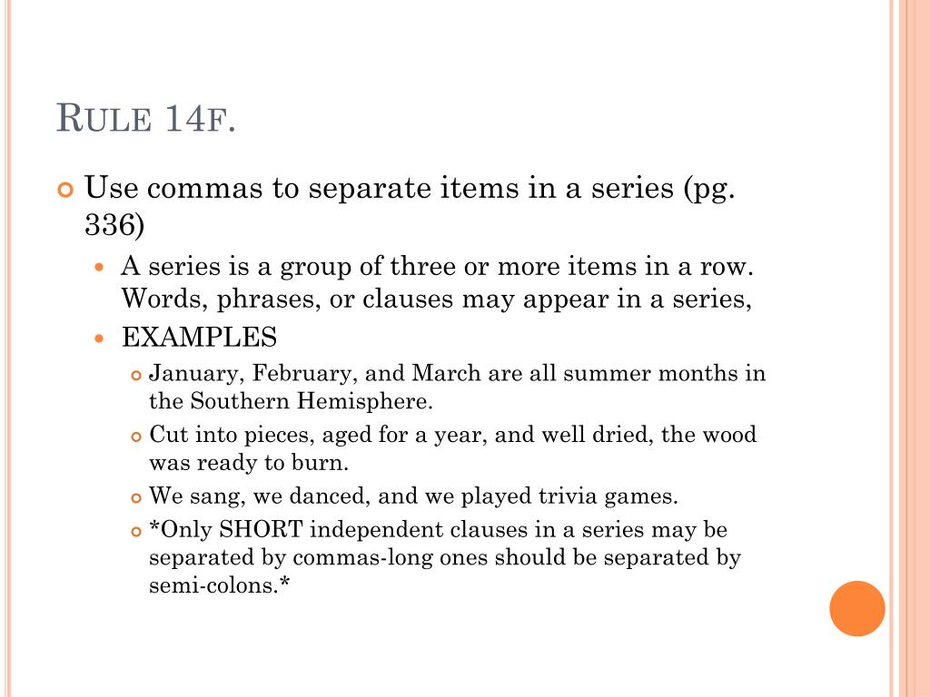 Rule 14f. • Use commas to separate items in a series (pg. 336) • A series is a group of three or more items in a row. Words, phrases, or clauses may appear in a series, • EXAMPLES • January, February, and March are all summer months in the Southern Hemisphere. • Cut into pieces, aged for a year, and well dried, the wood was ready to burn. • We sang, we danced, and we played trivia games. • *Only SHORT independent clauses in a series may be separated by commas-long ones should be separated by semi-colons.*