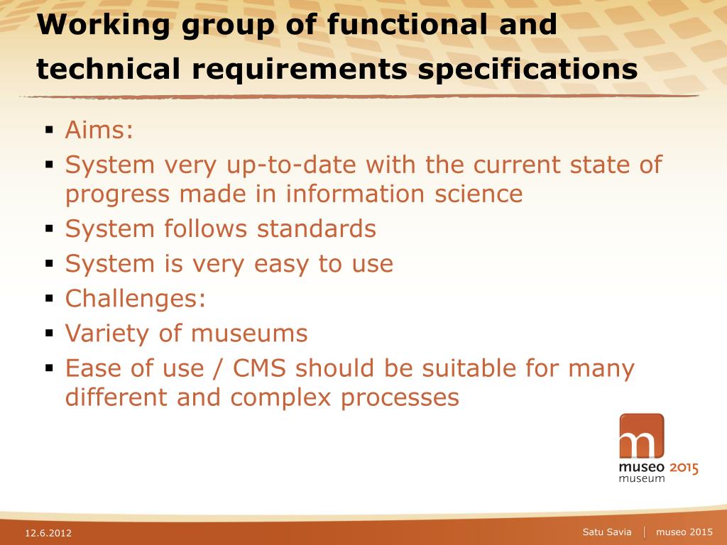 Working group of functional and technical requirements specifications • Aims: • System very up-to-date with the current state of progress made in information science • System follows standards • System is very easy to use • Challenges: • Variety of museums • Ease of use / CMS should be suitable for many different and complex processes Satu Savia
