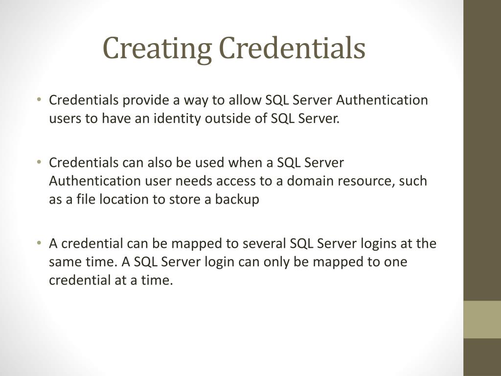Creating Credentials • Credentials provide a way to allow SQL Server Authentication users to have an identity outside of SQL Server. • Credentials can also be used when a SQL Server Authentication user needs access to a domain resource, such as a file location to store a backup • A credential can be mapped to several SQL Server logins at the same time. A SQL Server login can only be mapped to one credential at a time.