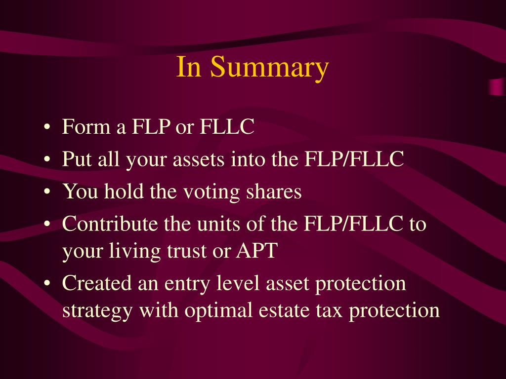 In Summary • Form a FLP or FLLC • Put all your assets into the FLP/FLLC • You hold the voting shares • Contribute the units of the FLP/FLLC to your living trust or APT • Created an entry level asset protection strategy with optimal estate tax protection