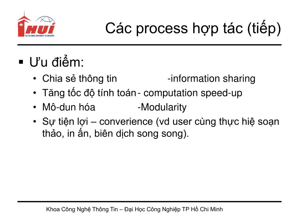 Ưu điểm: Chia sẻ thông tin -information sharing Tăng tốc độ tính toán - computation speed-up Mô-dun hóa -Modularity Sự tiện lợi – converience (vd user cùng thực hiệ soạn thảo, in ấn, biên dịch song song). Các process hợp tác (tiếp) Khoa Công Nghệ Thông Tin – Đại Học Công Nghiệp TP Hồ Chi Minh