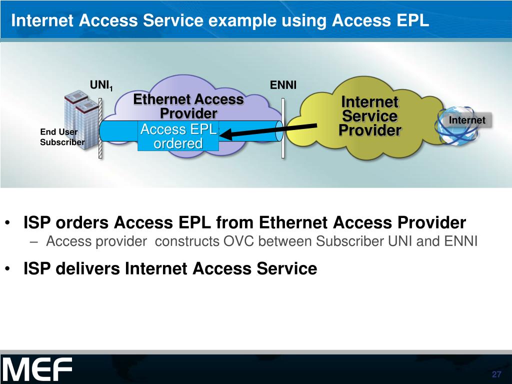 Internet Access Service example using Access EPL P2P OVC UNI1 ENNI Ethernet Access Provider Internet Service Provider Access EPL ordered Internet End User Subscriber • ISP orders Access EPL from Ethernet Access Provider • Access provider constructs OVC between Subscriber UNI and ENNI • ISP delivers Internet Access Service