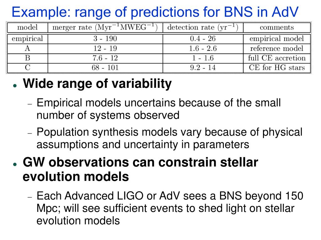 Example: range of predictions for BNS in AdV • Wide range of variability • Empirical models uncertains because of the small number of systems observed • Population synthesis models vary because of physical assumptions and uncertainty in parameters • GW observations can constrain stellar evolution models • Each Advanced LIGO or AdV sees a BNS beyond 150 Mpc; will see sufficient events to shed light on stellar evolution models
