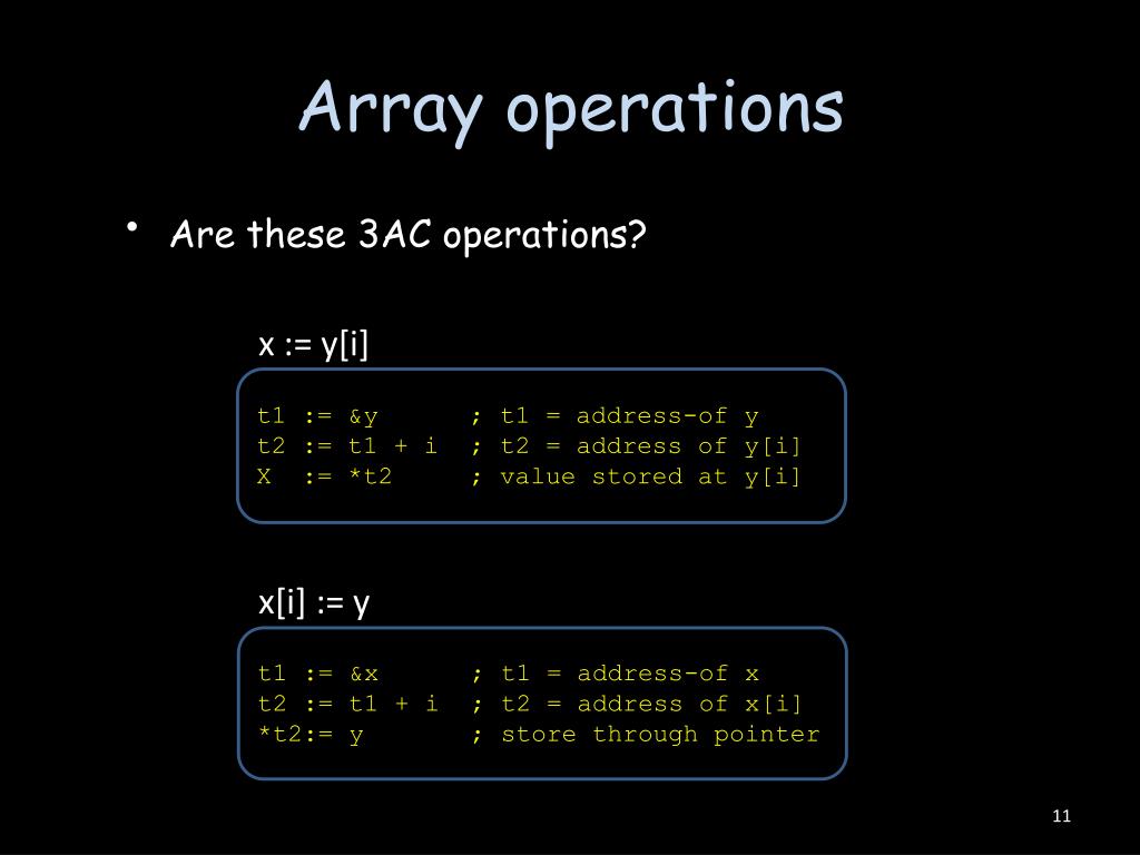 Array operations • Are these 3AC operations? x := y[i] t1 := &y ; t1 = address-of y t2 := t1 + i ; t2 = address of y[i] X := *t2 ; value stored at y[i] x[i] := y t1 := &x ; t1 = address-of x t2 := t1 + i ; t2 = address of x[i] *t2:= y ; store through pointer