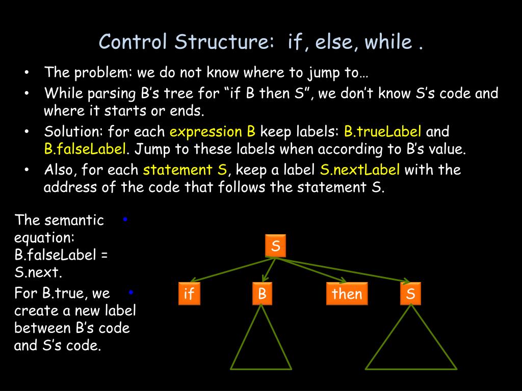 Control Structure:if, else, while. • The problem: we do not know where to jump to… • While parsing B’s tree for “if B then S”, we don’t know S’s code and where it starts or ends. • Solution: for each expression B keep labels: B.trueLabel and B.falseLabel. Jump to these labels when according to B’s value. • Also, for each statement S, keep a label S.nextLabelwith the address of the code that follows the statement S. • The semantic equation:B.falseLabel= S.next. • For B.true, we create a new label between B’s code and S’s code. S if B then S
