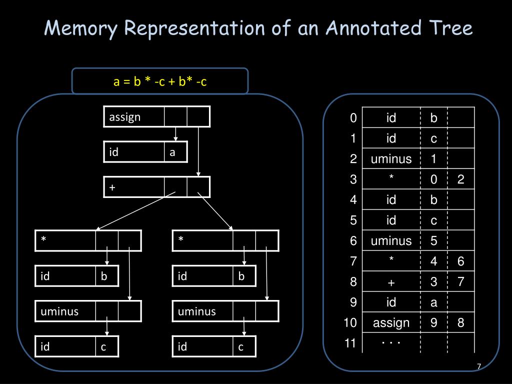 * * id id b b uminus uminus id id c c Memory Representation of an Annotated Tree a = b * -c + b* -c assign id a +