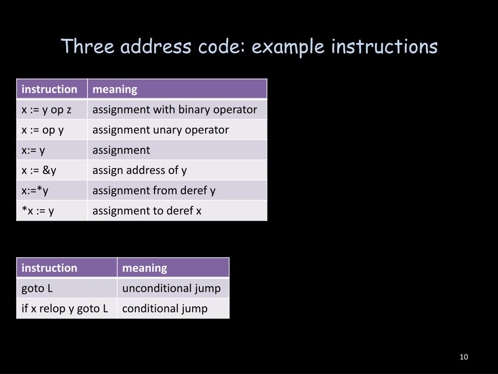 Three address code: example • int main(void) { • int i; • int b[10]; • for (i = 0; i < 10; ++i) • b[i] = i*i; • } i := 0 ; assignment L1: if i >= 10 goto L2 ; conditional jump t0 := i*i t1 := &b ; address-of operation t2 := t1 + i ; t2 holds the address of b[i] *t2 := t0 ; store through pointer i := i + 1 goto L1 L2: (example source: wikipedia)