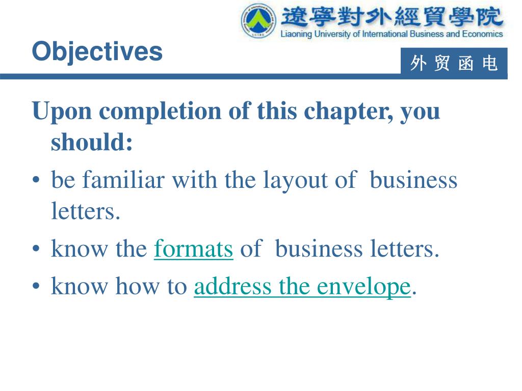 Objectives 外 贸 函 电 Upon completion of this chapter, you should: • be familiar with the layout of business letters. • know the formats of business letters. • know how to address the envelope.