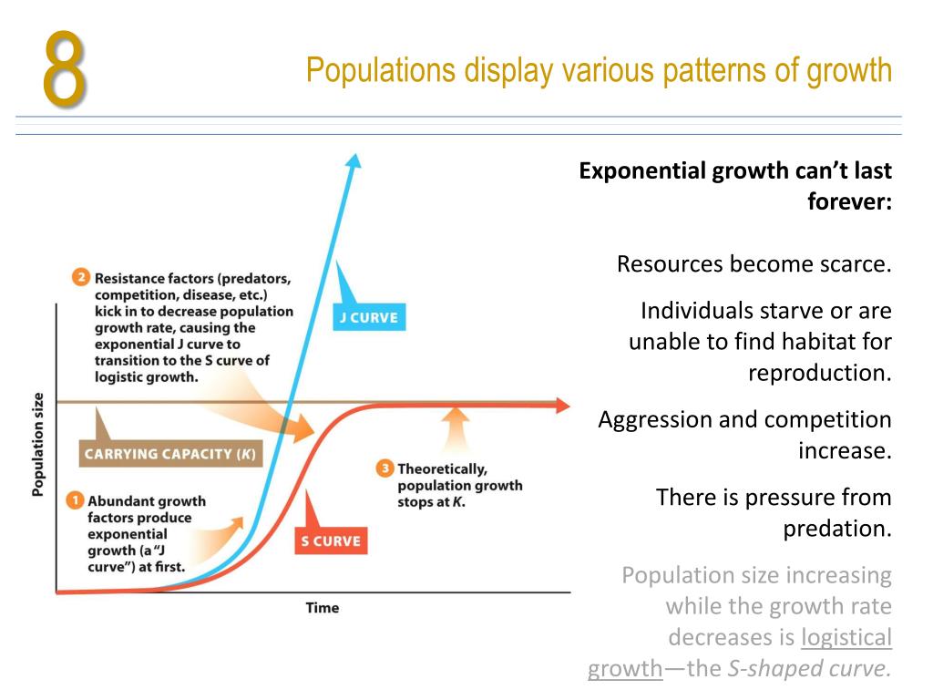 8 Populations display various patterns of growth Exponential growth can’t last forever: Resources become scarce. Individuals starve or are unable to find habitat for reproduction. Aggression and competition increase. There is pressure from predation. Population size increasing while the growth rate decreases is logistical growth—the S-shaped curve.