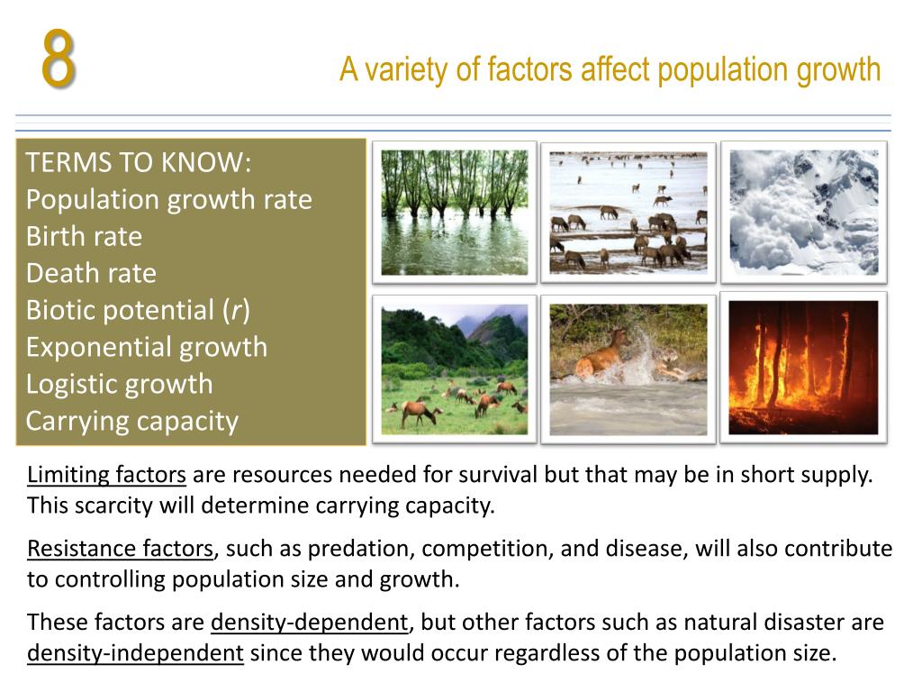 8 A variety of factors affect population growth TERMS TO KNOW: Population growth rate Birth rate Death rate Biotic potential (r) Exponential growth Logistic growth Carrying capacity Limiting factors are resources needed for survival but that may be in short supply. This scarcity will determine carrying capacity. Resistance factors, such as predation, competition, and disease, will also contribute to controlling population size and growth. These factors are density-dependent, but other factors such as natural disaster are density-independent since they would occur regardless of the population size.