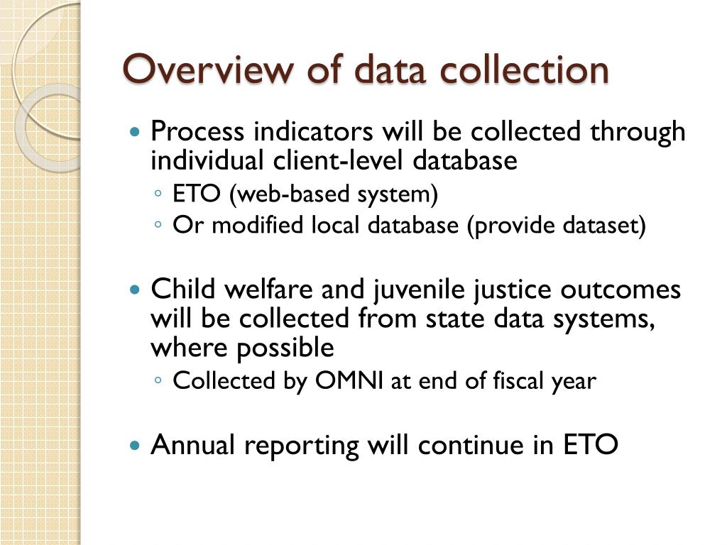 Overview of data collection • Process indicators will be collected through individual client-level database • ETO (web-based system) • Or modified local database (provide dataset) • Child welfare and juvenile justice outcomes will be collected from state data systems, where possible • Collected by OMNI at end of fiscal year • Annual reporting will continue in ETO
