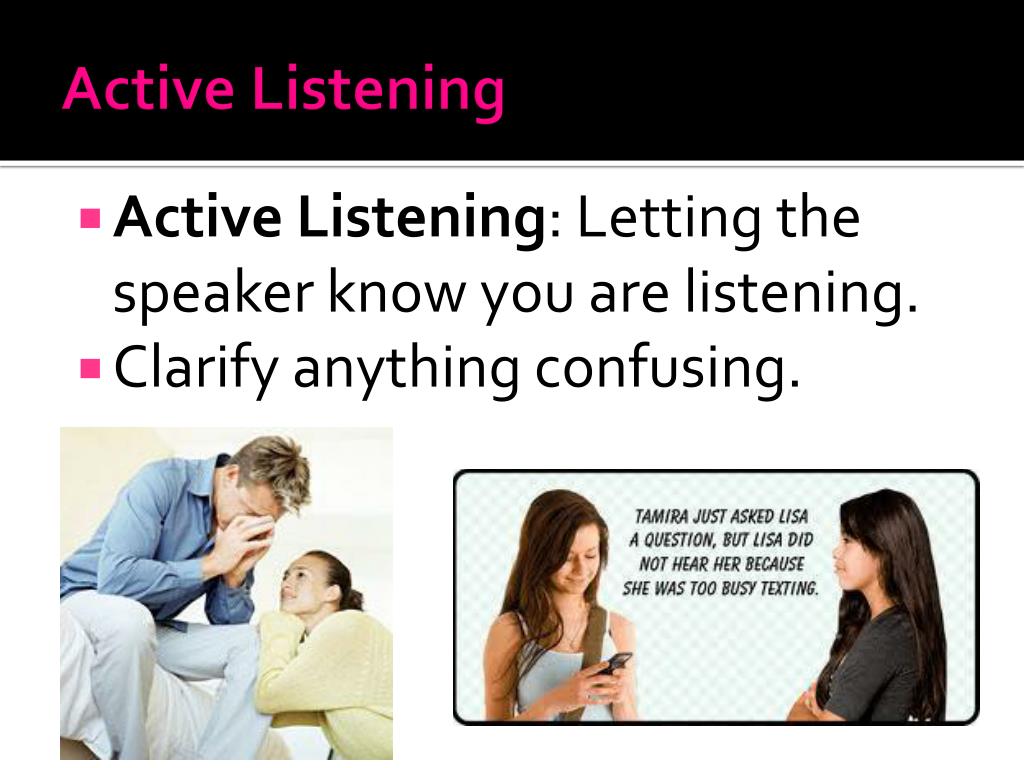 Active Listening • Active Listening: Letting the speaker know you are listening. • Clarify anything confusing.