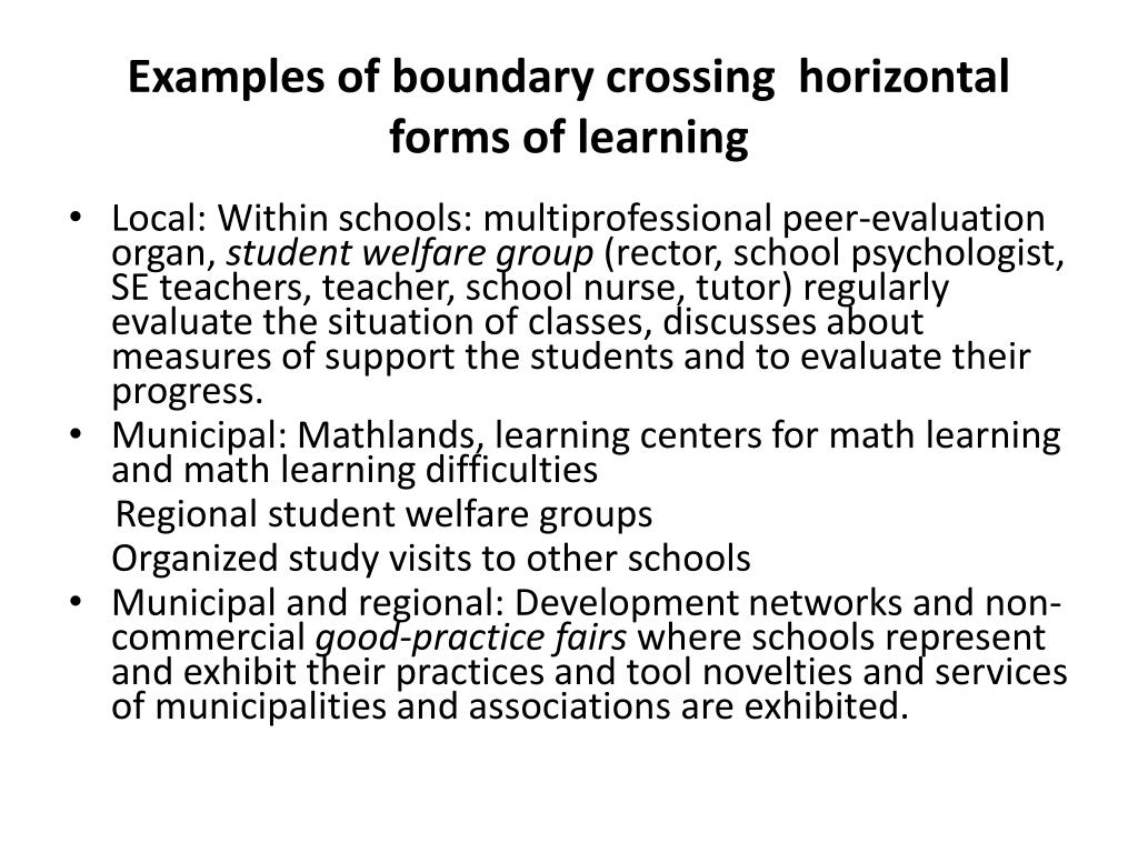 Examples of boundarycrossinghorizontalforms of learning • Local: Within schools: multiprofessional peer-evaluation organ, student welfare group (rector, school psychologist, SE teachers, teacher, school nurse, tutor) regularly evaluate the situation of classes, discusses about measures of support the students and to evaluate their progress. • Municipal: Mathlands, learning centers for math learning and math learning difficulties Regional student welfare groups Organized study visits to other schools • Municipal and regional: Development networks and non-commercial good-practice fairs where schools represent and exhibit their practices and tool novelties and services of municipalities and associations are exhibited.