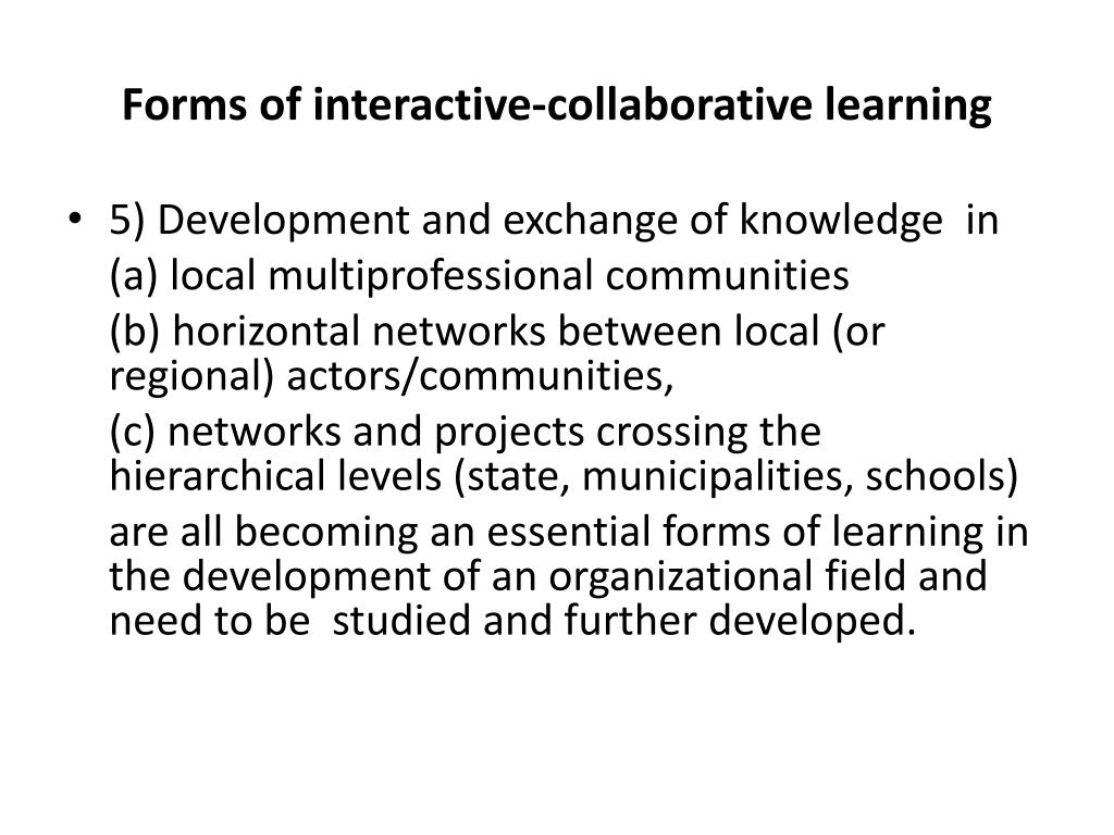Forms of interactive-collaborativelearning • 5) Development and exchange of knowledge in (a) localmultiprofessionalcommunities (b) horizontalnetworksbetweenlocal (orregional) actors/communities, (c) networks and projectscrossing the hierarchicallevels (state, municipalities, schools) areallbecoming an essentialforms of learning in the development of an organizationalfield and need to bestudied and furtherdeveloped.