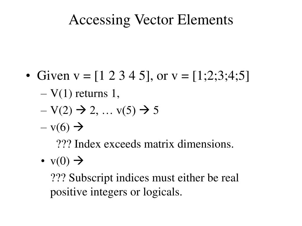 Accessing Vector Elements • Given v = [1 2 3 4 5], or v = [1;2;3;4;5] • V(1) returns 1, • V(2) 2, … v(5) 5 • v(6) ??? Index exceeds matrix dimensions. • v(0) ??? Subscript indices must either be real positive integers or logicals.