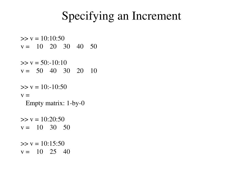 Specifying an Increment >> v = 10:10:50 v = 10 20 30 40 50 >> v = 50:-10:10 v = 50 40 30 20 10 >> v = 10:-10:50 v = Empty matrix: 1-by-0 >> v = 10:20:50 v = 10 30 50 >> v = 10:15:50 v = 10 25 40