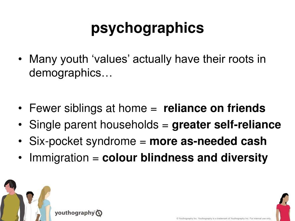 psychographics • Many youth ‘values’ actually have their roots in demographics… • Fewer siblings at home = reliance on friends • Single parent households = greater self-reliance • Six-pocket syndrome = more as-needed cash • Immigration = colour blindness and diversity