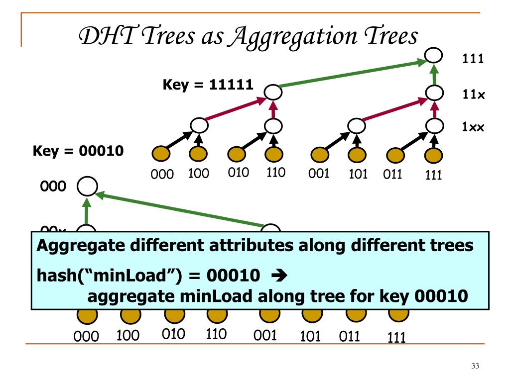 000 111 00x 11x 0xx 1xx 010 110 010 110 001 001 100 100 101 000 101 011 000 011 111 111 DHT Trees as Aggregation Trees Key = 11111 Key = 00010 Aggregate different attributes along different trees hash(“minLoad”) = 00010 aggregate minLoad along tree for key 00010