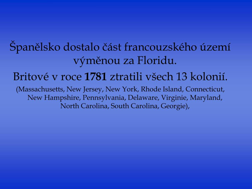 Španělsko dostalo část francouzského území výměnou za Floridu. Britové v roce 1781 ztratili všech 13 kolonií. (Massachusetts, New Jersey, New York, Rhode Island, Connecticut, New Hampshire, Pennsylvania, Delaware, Virginie, Maryland, North Carolina, South Carolina, Georgie),