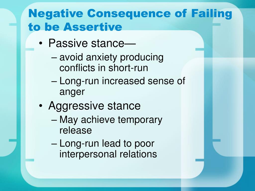 Negative Consequence of Failing to be Assertive • Passive stance— • avoid anxiety producing conflicts in short-run • Long-run increased sense of anger • Aggressive stance • May achieve temporary release • Long-run lead to poor interpersonal relations