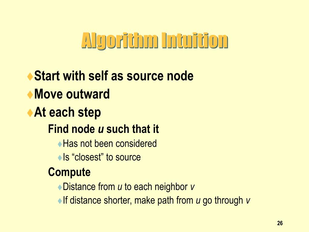 Algorithm Intuition • Start with self as source node • Move outward • At each step • Find node u such that it • Has not been considered • Is “closest” to source • Compute • Distance from u to each neighbor v • If distance shorter, make path from u go through v
