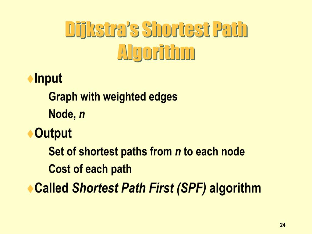 Dijkstra’s Shortest Path Algorithm • Input • Graph with weighted edges • Node, n • Output • Set of shortest paths from n to each node • Cost of each path • Called Shortest Path First (SPF) algorithm