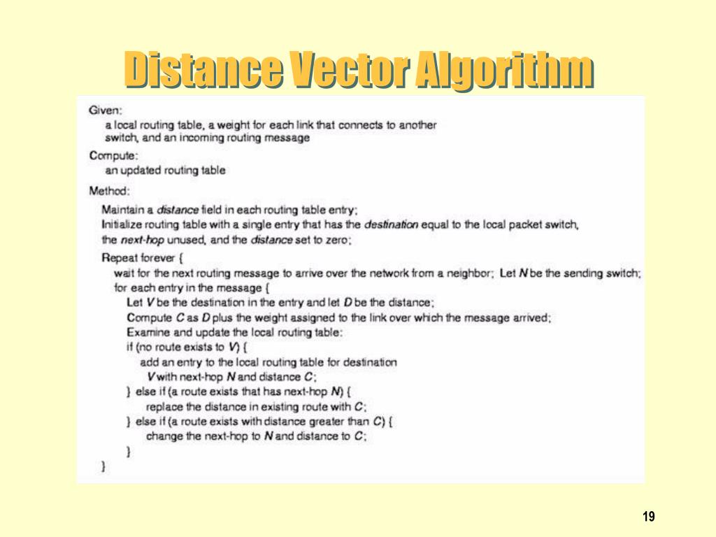 Distance Vector • Periodic, two-way exchange between neighbors • During exchange, switch sends • List of pairs • Each pair gives (destination, distance) • Receiver • Compares each item in list to local routes • Changes routes if better path exists