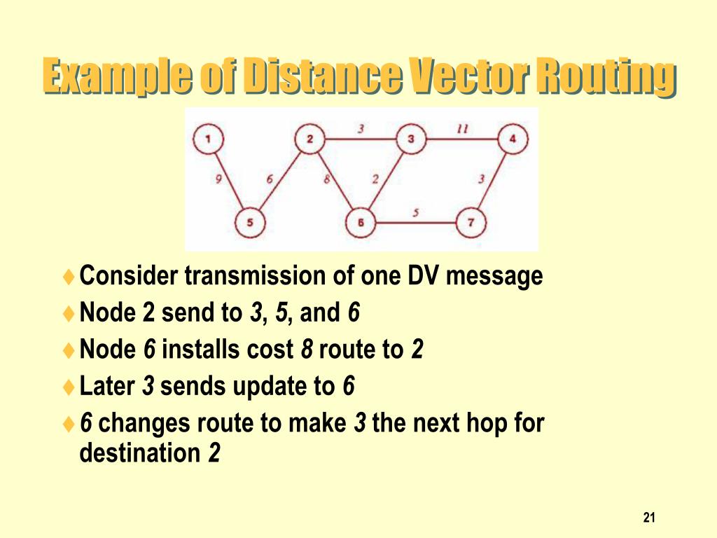 Example of Distance Vector Routing • Consider transmission of one DV message • Node 2 send to 3, 5, and 6 • Node 6 installs cost 8 route to 2 • Later 3 sends update to 6 • 6 changes route to make 3 the next hop for destination 2