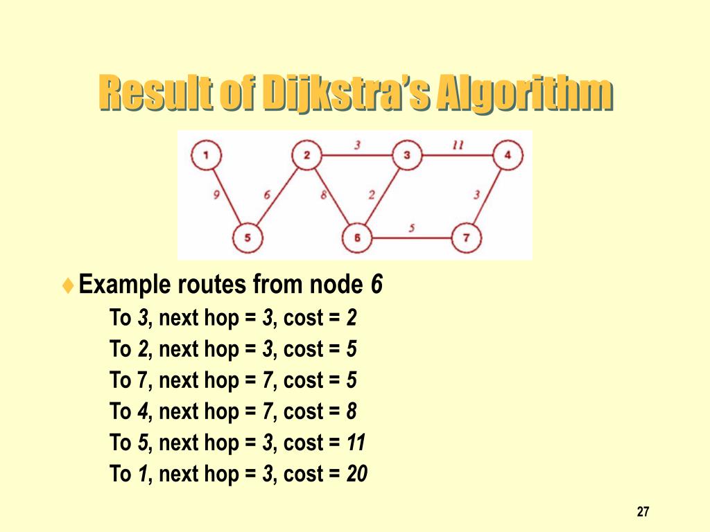 Result of Dijkstra’s Algorithm • Example routes from node 6 • To 3, next hop = 3, cost = 2 • To 2, next hop = 3, cost = 5 • To 7, next hop = 7, cost = 5 • To 4, next hop = 7, cost = 8 • To 5, next hop = 3, cost = 11 • To 1, next hop = 3, cost = 20