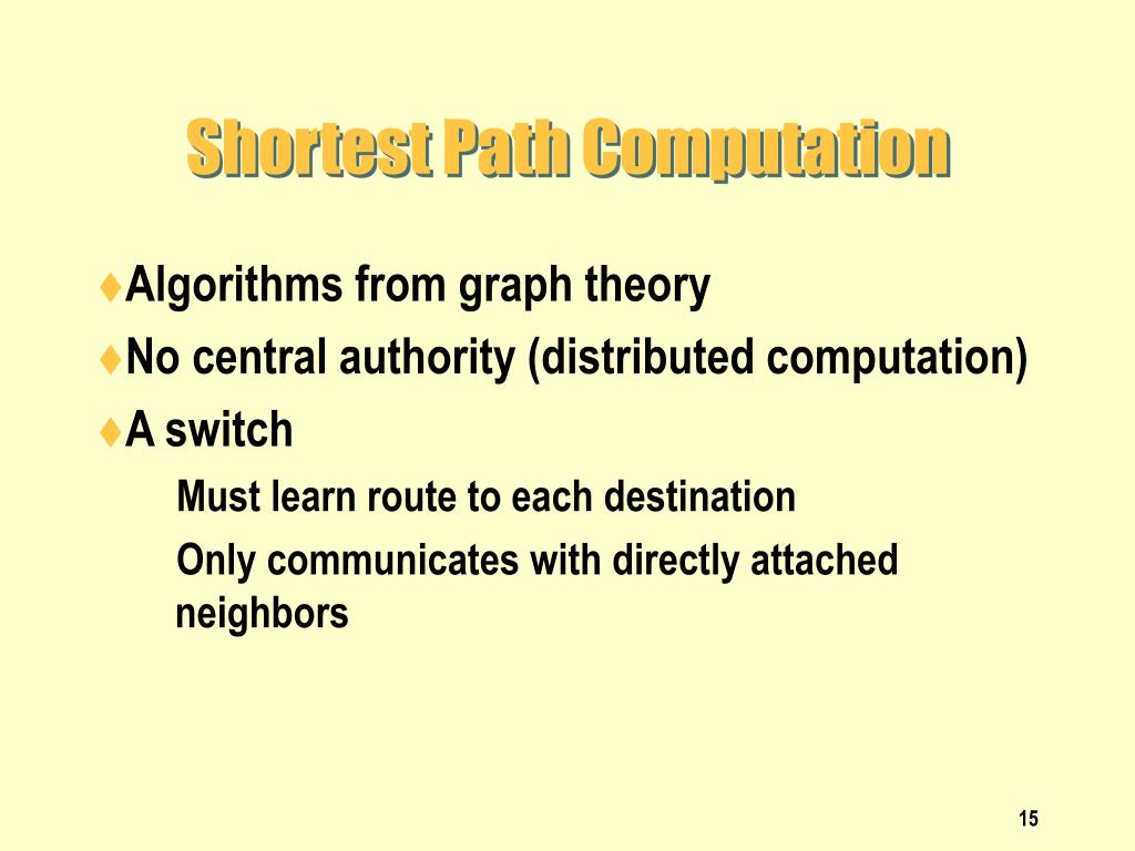 Shortest Path Computation • Algorithms from graph theory • No central authority (distributed computation) • A switch • Must learn route to each destination • Only communicates with directly attached neighbors