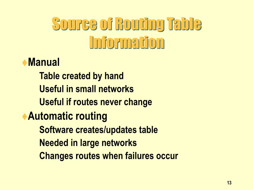 Source of Routing Table Information • Manual • Table created by hand • Useful in small networks • Useful if routes never change • Automatic routing • Software creates/updates table • Needed in large networks • Changes routes when failures occur