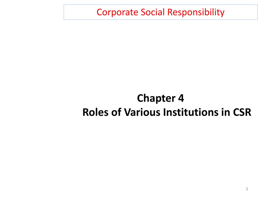 Corporate Social Responsibility Chapter 4Roles of Various Institutions in CSR