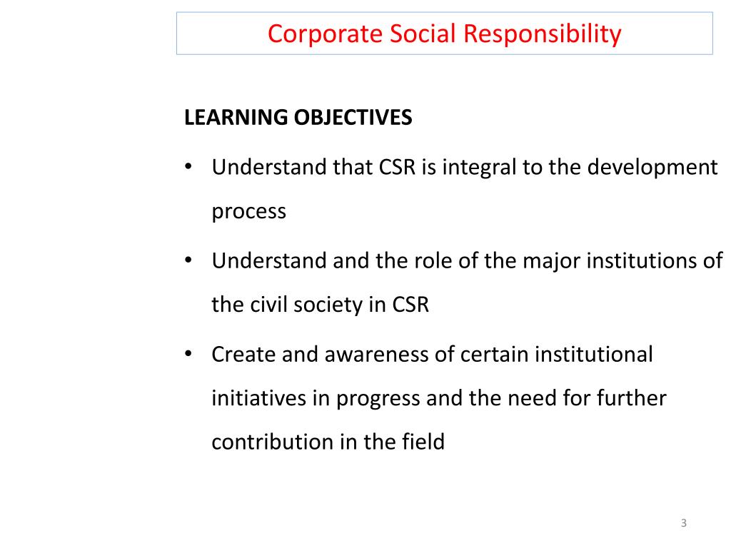 Corporate Social Responsibility LEARNING OBJECTIVES • Understand that CSR is integral to the development process • Understand and the role of the major institutions of the civil society in CSR • Create and awareness of certain institutional initiatives in progress and the need for further contribution in the field