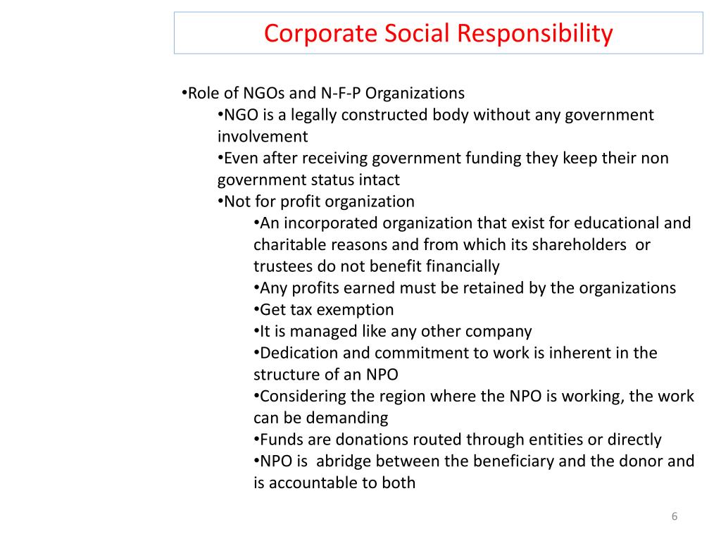 Corporate Social Responsibility • Role of NGOs and N-F-P Organizations • NGO is a legally constructed body without any government involvement • Even after receiving government funding they keep their non government status intact • Not for profit organization • An incorporated organization that exist for educational and charitable reasons and from which its shareholders or trustees do not benefit financially • Any profits earned must be retained by the organizations • Get tax exemption • It is managed like any other company • Dedication and commitment to work is inherent in the structure of an NPO • Considering the region where the NPO is working, the work can be demanding • Funds are donations routed through entities or directly • NPO is abridge between the beneficiary and the donor and is accountable to both