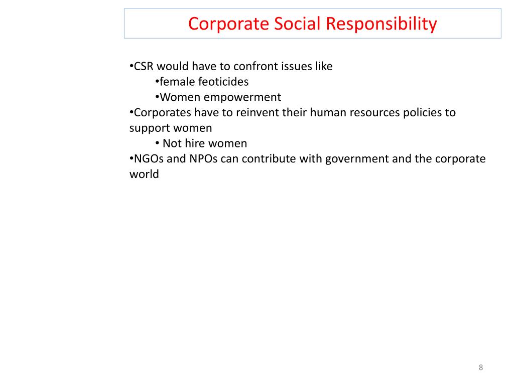 Corporate Social Responsibility • CSR would have to confront issues like • female feoticides • Women empowerment • Corporates have to reinvent their human resources policies to support women • Not hire women • NGOs and NPOs can contribute with government and the corporate world
