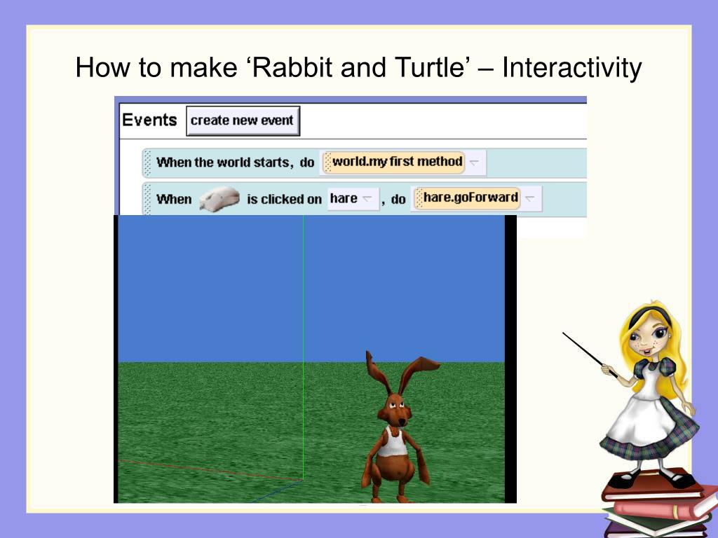How to make ‘Rabbit and Turtle’ - Scenario • There’s a rabbit always arrogant, so a turtle is mad at her attitude • The rabbit and turtle race • The rabbit runs fast, finds some food, eats a lot and goes to sleep • The turtle keeps on going and wins the race