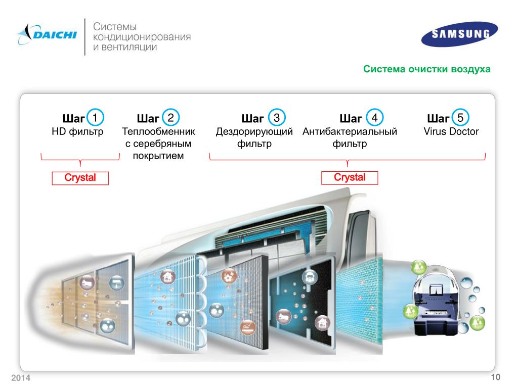 Система очистки воздуха Шаг Шаг Шаг Шаг Шаг 1 2 3 4 5 HD фильтр Теплообменникс серебрянымпокрытием Дездорирующий фильтр Антибактериальный фильтр Virus Doctor Crystal Crystal