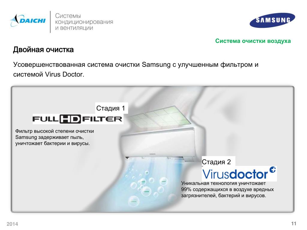 Система очистки воздуха Двойная очистка Усовершенствованная система очистки Samsung с улучшенным фильтром и системой VirusDoctor. Стадия 1 Фильтр высокой степени очистки Samsung задерживает пыль, уничтожает бактерии и вирусы. Стадия 2 Уникальная технология уничтожает 99% содержащихся в воздухе вредных загрязнителей, бактерий и вирусов.