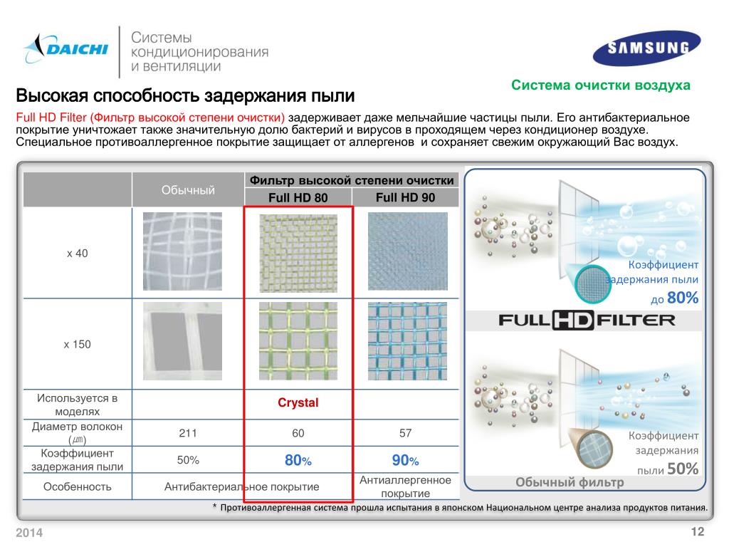 Система очистки воздуха Высокая способность задержания пыли Full HD Filter (Фильтр высокой степени очистки) задерживает даже мельчайшие частицы пыли. Его антибактериальное покрытиеуничтожает также значительную долю бактерий и вирусов в проходящем через кондиционер воздухе.Специальное противоаллергенное покрытие защищает от аллергенов и сохраняет свежим окружающий Вас воздух. Коэффициент задержания пыли до80% Коэффициент задержания пыли 50% Обычный фильтр * Противоаллергенная система прошла испытания в японском Национальном центре анализа продуктов питания.