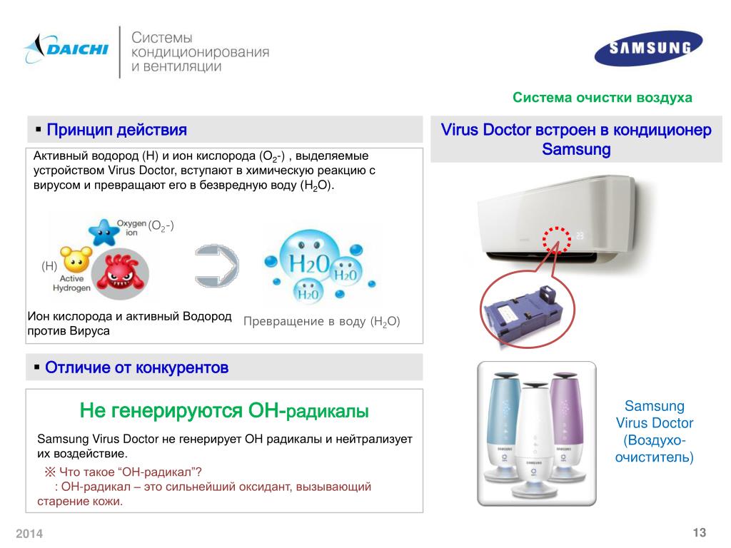 Система очистки воздуха • Принцип действия VirusDoctor встроен в кондиционер Samsung (O2-) Активный водород (H) и ион кислорода (O2-) , выделяемые устройством Virus Doctor,вступают в химическую реакцию с вирусом и превращают его в безвредную воду (H2O). (H) Ион кислорода и активный Водород против Вируса Превращение в воду (H2O) • Отличие от конкурентов Не генерируются OH-радикалы Samsung Virus Doctor (Воздухо-очиститель) Samsung Virus Doctor не генерирует OH радикалы и нейтрализует их воздействие. ※ Что такое “OH-радикал”? : OH-радикал – это сильнейший оксидант, вызывающий старение кожи.