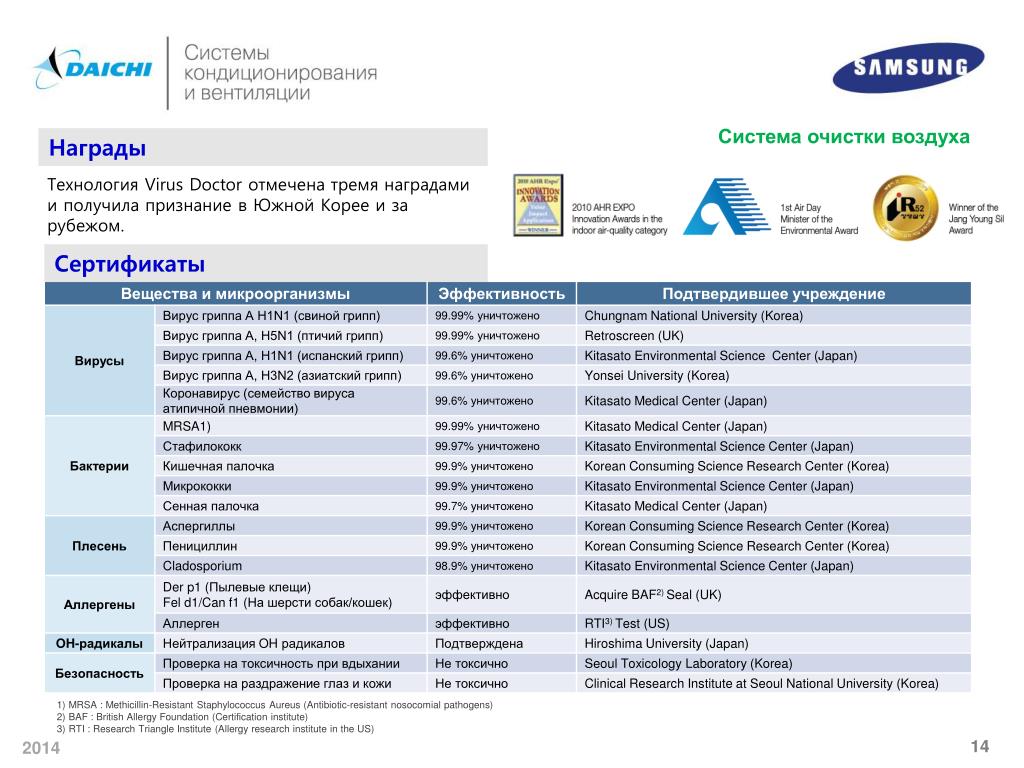 2-1) Virus Doctor Система очистки воздуха Награды Технология Virus Doctor отмечена тремя наградами и получила признание в Южной Корее и за рубежом. Сертификаты 1) MRSA : Methicillin-Resistant Staphylococcus Aureus (Antibiotic-resistant nosocomial pathogens) 2) BAF : British Allergy Foundation (Certification institute) 3) RTI : Research Triangle Institute (Allergy research institute in the US)